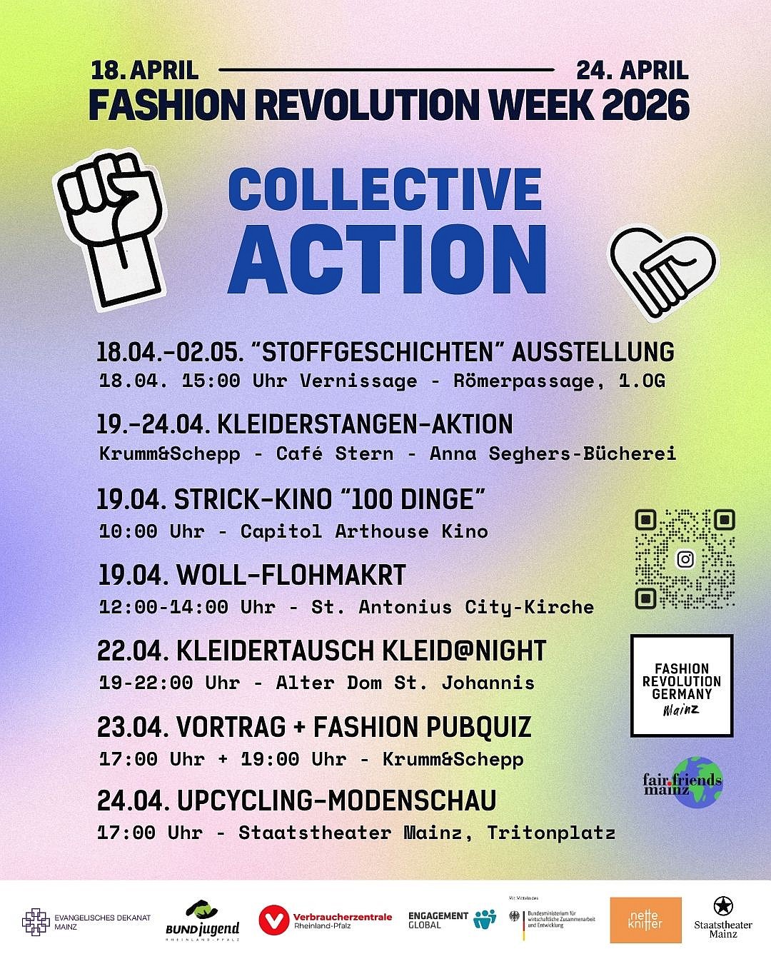 Unter dem Motto „Collective Action“ hat FAIR FRIENDS MAINZ, ein Zusammenschluss aus dem Ev. Dekanat Mainz ein vielfältiges Programm für die Fashion Revolution Week vom 18. April bis 2. Mai zusammengestellt. Weitere Infos unter Termine